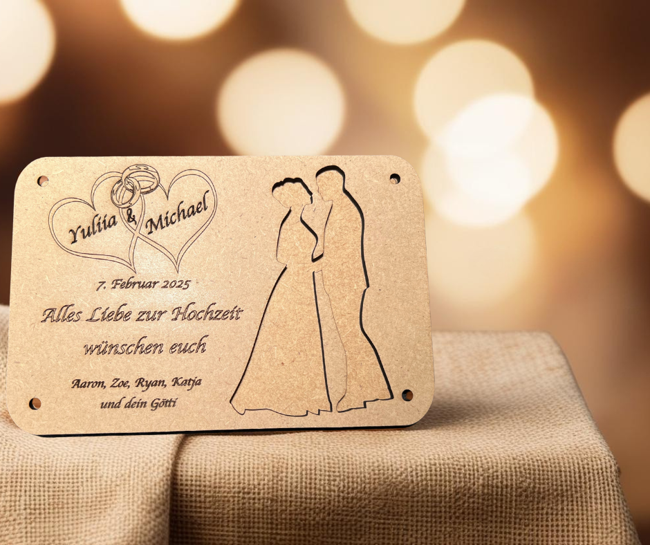 Wir arbeiten hauptsächlich mit Holz und Kunstleder, gravieren aber auch einige Metalloberflächen. Die Bilder in unseren Referenzen zeigen dir eine gute Auswahl an Möglichkeiten – von rustikalen Holzschildern bis zu filigranen Geschenkartikeln.
